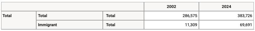 So let’s look at the big picture first. Migration is not a recent phenomenon in Iceland: looking at the net migration figures, the number of foreign citizens has been steadily increasing since the mid-1990s5, decreasing momentarily only in 2009 and 2010 - presumably as a consequence of the financial crash of 2008. Since then, there have been three peaks of new arrivals: one in 2006, one in 2017 and one in 2022. In 2024 more than 69 thousands foreign citizens were living in Iceland, making up 18.1% of the total population. When the movie came out in 2002 the percentage of foreign nationals was around 4%.