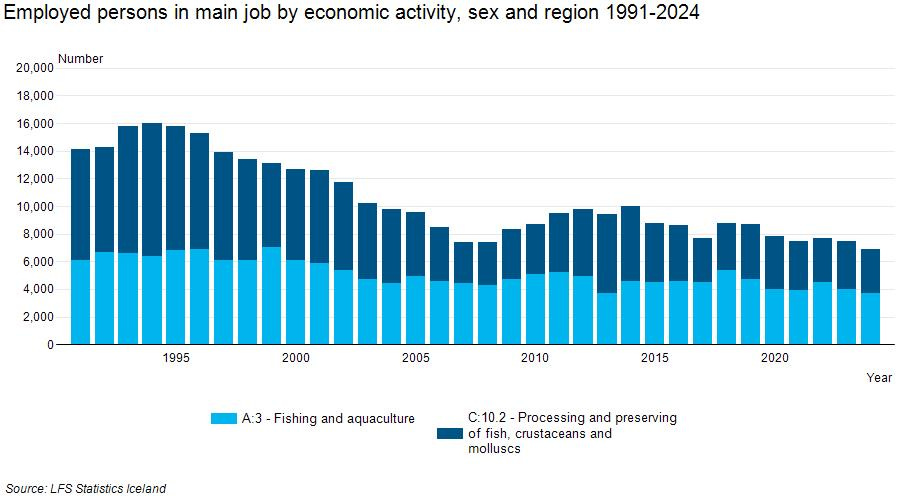 According to Statistics Iceland, around 3 700 people were employed in the ‘fishing and aquaculture’ sector in Iceland in 2024, that is, 1.7% of the total workforce1. To that, one should add those employed in the fish processing industry (3 200 people), taking the total to around 7 000, that is, around 3% of the working population2. Overall, the industry has shrinked by more than half since the mid nineties, when the whole sector employed around 16 000 people, and it had already become significantly smaller by the time the movie was shot and released in 2002, when it employed 11 700 people, or 7.5% of the the working population3.