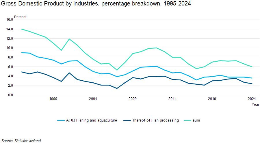Not surprisingly, the fishing industry has also receded in terms of share of the GDP: here it went form making up almost a seventh of the whole economy (14%) in the early 1990s, to around 10% in 2002 and 6% in 2024.